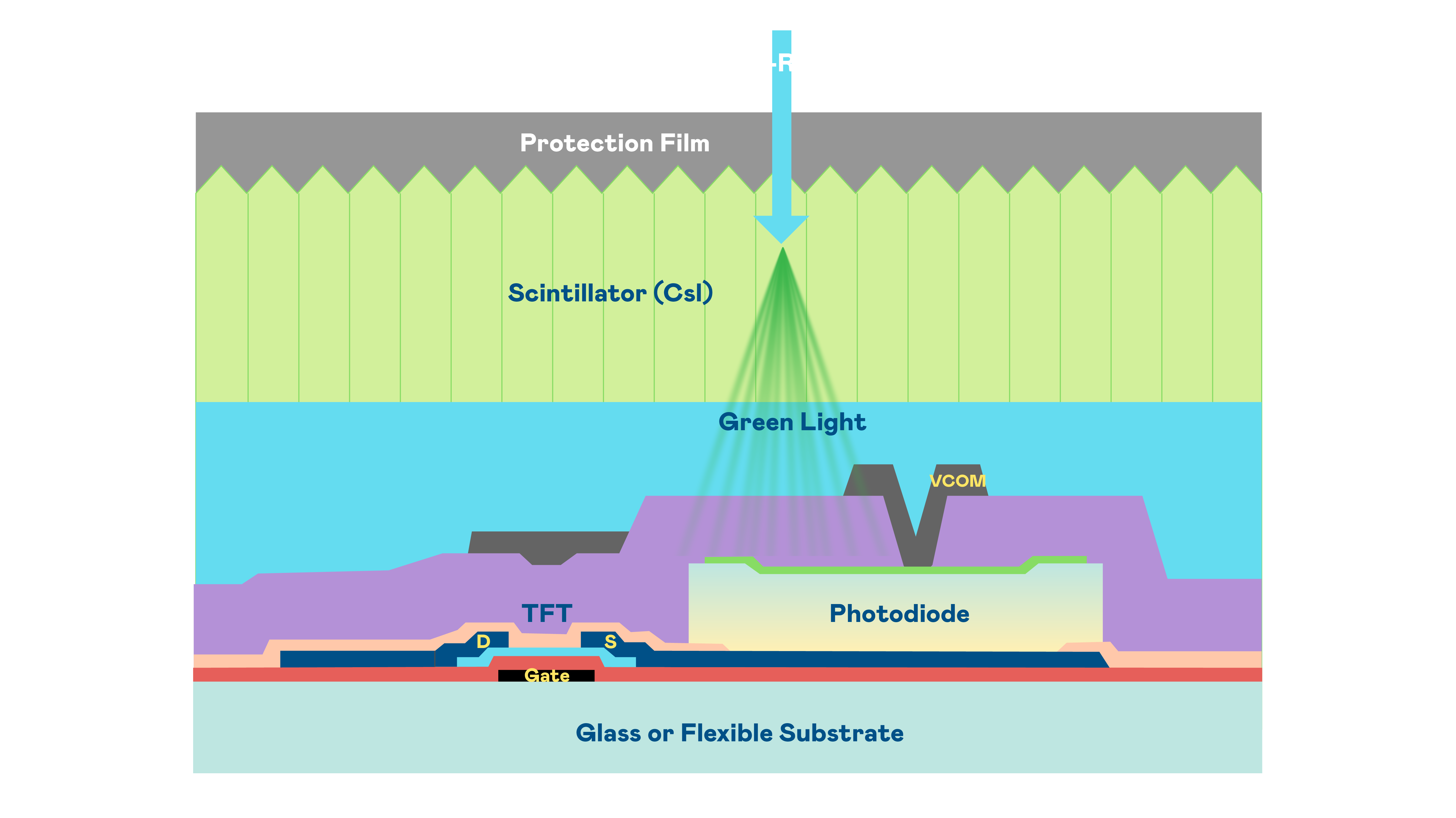 巅峰国际的X光影像感測陣列使用薄膜電晶體 (TFT) 作為每個像素的讀取開關,搭配光電二極體(Photodiode)的光電轉換元件,用以感測X光影像訊號。